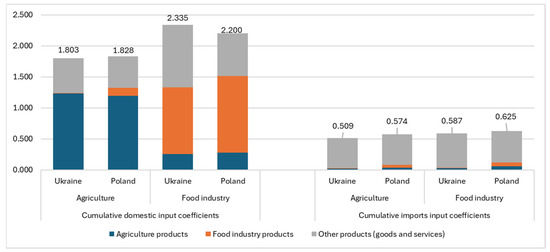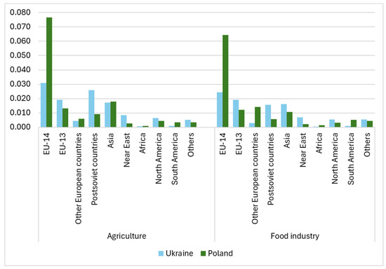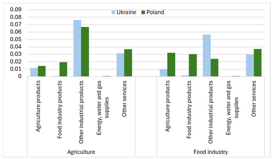 Secondly, the Polish agri-food sector is characterized by higher import intensity of gross output. This means that more materials from abroad are required to produce one unit of gross output from the sector in Poland than in Ukraine. It is evidenced by the direct and total (direct and indirect) import intensity coefficients of the final production of the agri-food sector in Ukraine and Poland. As a result, each subsequent unit of gross exports of the Polish agri-food sector generates less domestic value added than in Ukraine. However, the higher import dependency of Poland′s agri-food sector should not be viewed negatively. Without the import of raw materials, many branches of the food industry, such as tobacco, fish, confectionery, or coffee and tea processing, would not have developed.
