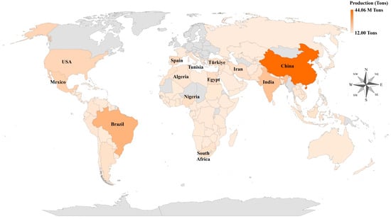 One of the most widely grown fruits worldwide is citrus [], with a global production of around 162 million tons in 2021 []. The world’s top producers of citrus fruits are China, Brazil, and India [,], as shown in Figure 1. The citrus supply chain involves various stakeholders and spans across the globe, with an average trade value of around 98 million metric tons in 2021 []. Figure 2 displays the trade value of the top countries exporting citrus fruits in 2021. Citrus fruits, such as lemons, oranges, and grapefruits, are a prominent feature of the Mediterranean region’s landscape and culture, and they are a key commodity in trade relations among the European Union (EU), the Middle East, and Africa. These regions have different roles and interests in the citrus sector, depending on their production, consumption, and export patterns [,]. Figure 3 illustrates the top citrus producers in the EU, Middle East, and Africa regions. Spain is the primary citrus supplier to the EU market, while the Middle East and Africa continue to be strategic export markets outside the EU [,].
