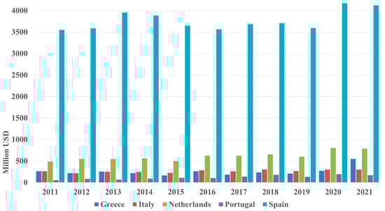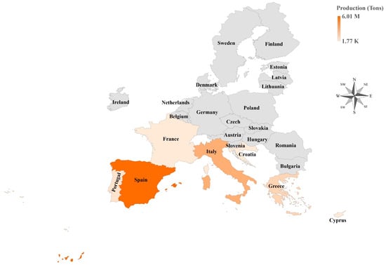 The European Union (EU) is a significant player in the citrus fruit industry, with a total production of 11.48 million metric tons in 2021 [] and a trade value of approximately USD 6.01 billion. Citrus fruits were the second most produced fruit in Europe in 2022 []. Spain and Italy are the top producers, with Spain’s production exceeding 6 million tons [] and an export value of over USD 4.1 billion in 2021 []. Italy’s exports were valued at nearly USD 300 million []. The Netherlands, Greece, and Portugal also play key roles in exports, with values of USD 785.1 million, USD 547.7 million, and USD 168.0 million, respectively []. Spain’s dominance in production and exports solidifies its status as a global leader. Figure 4 illustrates citrus production in the EU, while Figure 5 provides a comprehensive perspective on the export dynamics within the EU from 2011 to 2021, highlighting Spain’s leading position.