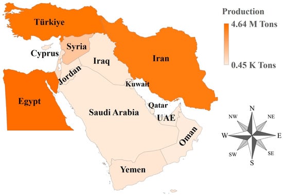 The Middle East is a crucial region in the global citrus market, with Egypt, Turkey, and Iran as key players. Egypt produced 4.64 million tons of citrus in 2021 [], with an export value of USD 981.6 million. Turkey’s production was 4.3 million tons [], with an export value of USD 981.6 million []. Iran produced over 4 million tons, showcasing its agricultural capacity [].