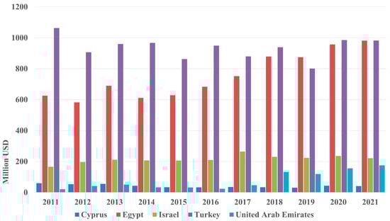 Figure 6 and Figure 7 underscore the region’s importance in global agriculture and trade. Figure 6 shows citrus production in Middle Eastern countries, while Figure 7 illustrates the export values of the top five exporters in the region from 2011 to 2021. Egypt has seen the greatest increase in trade value, while Turkey remains the largest exporter, primarily to Russia.