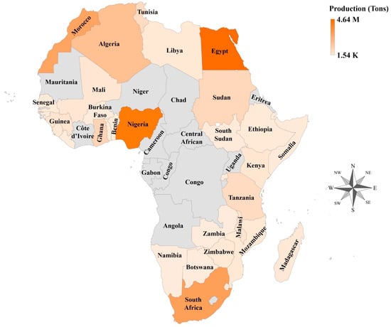 Africa’s citrus industry is growing, with Egypt, Nigeria, South Africa, and Morocco as standout performers. Egypt leads with 4.64 million tons of production [] and an export value of USD 981.6 million in 2021 []. Nigeria produced around 20.16 million tons in 2023 []. South Africa is a dominant exporter, contributing over USD 1.9 billion in 2021 []. Morocco produced over 2.6 million tons with an export value of USD 566 million []. Tunisia, though producing smaller amounts, had an export value of nearly USD 13 million []. Figure 8 illustrates citrus production in Africa, while Figure 9 highlights the export evolution in Africa from 2011 to 2021, showcasing the consistent performance of Egypt and the growth of Morocco and South Africa. South Africa exports mainly to Europe and Asia, supported by industry associations such as the Citrus Growers’ Association and the Perishable Products Export Control Board. These associations facilitate trade, inspect products, and manage export regulations []. Interviews with Egyptian stakeholders revealed a need for similar organizations in Egypt to introduce sustainable technologies and policies, standardize practices, and increase exports.
