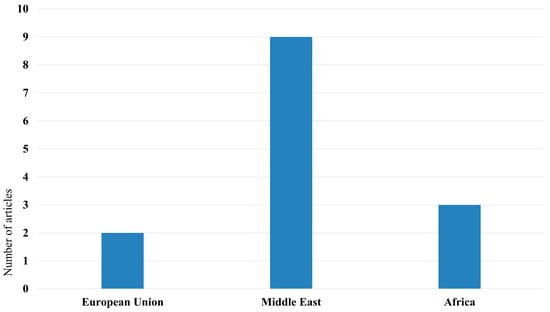 The distribution of studied geographical regions in the reviewed papers is shown in Figure 12. There is a notable scarcity of research in Africa and the European Union compared to the Middle East, despite the significant role of citrus in Africa in terms of production and trade and in the European Union in terms of imports and trade.