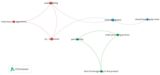 Regarding the keywords used in the papers, 62 keywords were identified, with 10 occurring at least twice. In total, 2 of these keywords were excluded from the analysis, as they were part of the search string. The most frequent keywords are CO2 emissions, sustainability, and reverse logistics. The network visualization of keyword co-occurrence is presented in Figure 14. Each node represents a keyword, and the lines indicate connections between them. The size of the node reflects the frequency of occurrence, while the thickness of the lines indicates the frequency of co-occurrence. The keywords are clustered into three groups: sustainability aspects and meta-heuristics (red), reverse logistics (blue), and order-promising process (green).