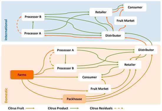 In the domestic section, the supply chain begins at farms, where citrus fruits are grown and harvested. The harvested fruits are then sent to a packhouse, processor A, processor B, and/or fruit market; in some cases, fruits can be sold directly to consumers. The packhouse is where fruits undergo various processes, such as cleaning, sorting, and packaging, and are then prepared to be sent to distributors, fruit markets, and/or retailers. At processor A, citrus fruits are transformed into primary citrus products. These could be basic products such as fresh juice ready for consumption or juice concentrates. Some of these primary products are then sent to processor B, which produces secondary citrus products. These could be products such as marmalades, jams, canned fruits, or other processed food items. Processor B may use the processing fruit residuals from processor A or lower-grade fruits from farms directly. The different roles between processor A and processor B allow for a wider variety of products to be produced from the harvested citrus fruits. The primary and secondary citrus products are then sent to distributors and retailers for sale. The fruit markets and distributors could be wholesale markets where retailers purchase stock, while the retailers could be supermarkets or stores where consumers can purchase fruits and/or products.