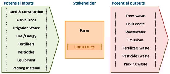 The potential inputs at the farm include land and construction, citrus trees, irrigation water, fuel/energy, fertilizers, pesticides, equipment, and packing material. The potential outputs involve various types of waste such as tree waste, fruit waste, wastewater, emissions, fertilizers waste, pesticides waste, and packing waste, along with the primary output at the farm, which is the citrus fruits (shown under the name of stakeholder “Farm” in the figure). Citrus fruits, being the foundation of the citrus supply chain, serve as the main input to all the subsequent stages.