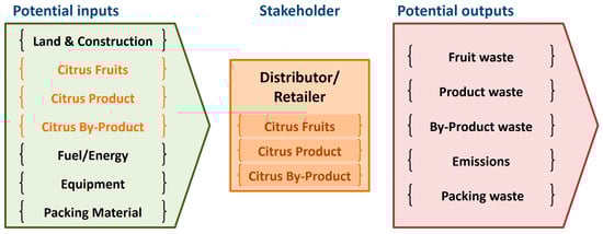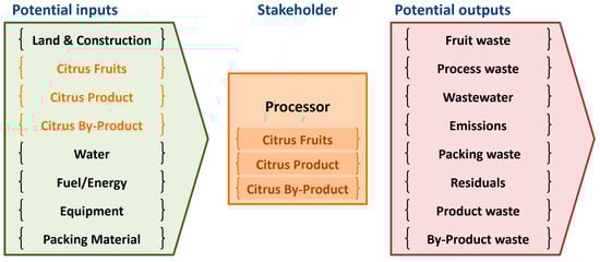 In the processing stage, including the packhouse, processor A, and processor B, the raw materials are converted into finished products. Inputs at this stage include land and construction, water, fuel/energy, equipment, and packing material, as shown in Figure 17. Given the variety of processors mentioned earlier, the raw materials can vary depending on the role of the processor, with citrus fruits, citrus products, and/or citrus by-products being the key input(s) for the processor (shown in orange within the inputs in the figure). The expected outputs, other than the primary product itself (shown under the name of stakeholder “Processor” in the figure), are fruit waste, process waste, wastewater, emissions, packing waste, residuals, citrus product waste, and by-product waste.