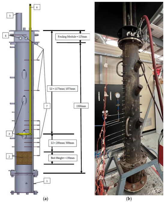 (a) Combustor sectional view and (b) lab set-up: (1) primary air inlet ports (2×), (2) packed fuel bed, (3) fuel charging ports, (4) fouling module and air-cooled fouling deposition probes, (5) exhaust stack, (6) secondary air supply line and distribution, (7) thermocouples.