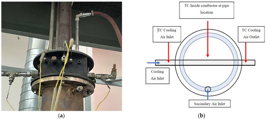 Figure 1 shows the experimental set-up of the fixed-bed combustor, which is designed to be modular. The main column is fabricated from SS310 stainless steel (202 mm inner diameter, 8.50 mm wall thickness, height 1500 mm). The column’s ends terminate at flanges (230 mm outer diameter), where the air plenum (bottom) and fouling modules (top) are attached to the combustor body. During the experiment, the fuel was batch-fed (manually) into the combustor through fuel charging ports to form a finite-height packed fuel bed on a fixed stainless steel grate. Fuel ignition was initiated through the same side port by injecting 15 mL of methylated spirits (96% ethanol) and igniting it using a handheld butane torch. Once ignited at the bed’s top surface, the counter-flowing primary air (Qp) that was introduced though the plenum and the circular perforations of the grate from beneath the fuel bed then caused a reaction front to propagate downwards and opposite to the primary air flow. The secondary air (Qs) was introduced to the combustion column through the secondary air assembly, which consists of a circular ring with 8 equally distributed 3 mm holes on the inner periphery of the ring. The secondary air assembly divides the space above the fuel bed into the primary freeboard (LI) and secondary freeboard (LII), based on the location of introducing secondary air staging. The total air flowrate was provided from an air compressor and passed through air flowmeters to the primary and secondary air. The primary and secondary air supply was delivered via a screw-type air compressor connected to a flow control board equipped with a pressure regulator and four calibrated flowmeters (Influx, model LV2S15-AI 27), with an accuracy of ±5% full scale. More details on the combustor and its set-up are available in the literature [16,17,18,19,20].
