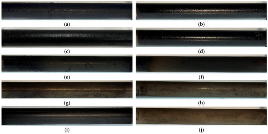 Deposit pipes’ physical appearance: (a) Qs/Qt = 0.33 at LI = 200 mm, (b) Qs/Qt = 0.33 at LI = 300 mm, (c) Qs/Qt = 0.50 at LI = 200 mm, (d) Qs/Qt = 0.50 at LI = 300 mm, (e) Qs/Qt = 0.66 at LI = 200 mm, (f) Qs/Qt = 0.66 at LI = 300 mm, (g) Qs/Qt = 0.71 at LI = 200 mm, (h) Qs/Qt = 0.71 at LI = 300 mm, (i) Qs/Qt = 0.75 at LI = 200 mm, and (j) Qs/Qt = 0.75 at LI = 300 mm.