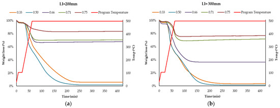 Normalised weight loss percentages of fouling deposits derived from TGA (left Y-axis) at Qs/Qt = 0.33 to 0.75; program temperature (right Y-axis). Conditions: (a) LI = 200 mm and (b) LI = 300 mm.