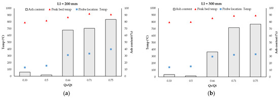 Figure 5a,b show the temperature data and ash fouling deposits for LI = 200 mm and LI = 300 mm. A notable observation is that, although the primary air flow through the fuel bed remained unchanged throughout, at Qp = 140 L·min−1 (0.089 kg·m−2·s−1), the peak temperatures in the fuel bed increased with higher Qs/Qt values. This behaviour aligns with prior research by Junejo et al. [16], who analysed fuel bed temperatures across various secondary-to-total air ratios and primary freeboard lengths while holding the primary air flowrate constant, revealing consistent trends. The observed rise in peak bed temperature with increasing Qs/Qt values can be attributed to the fact that, despite the high flowrates at Qs/Qt = 0.66, 0.71, and 0.75, there was no suppression of the reactions within the bed, which instead aided the combustion process. Higher Qs/Qt values (0.66, 0.71, and 0.75) may facilitate combustion in the uppermost layers of the fuel bed. Consequently, this leads to possible temperature increases in the fuel bed itself. This trend was consistent across both primary freeboard lengths in the experiment, with the peak bed temperatures at LI = 200 mm recorded as 790, 818, 868, 919, and 908 °C for corresponding Qs/Qt values of 0.33, 0.50, 0.66, 0.71, and 0.75, respectively.