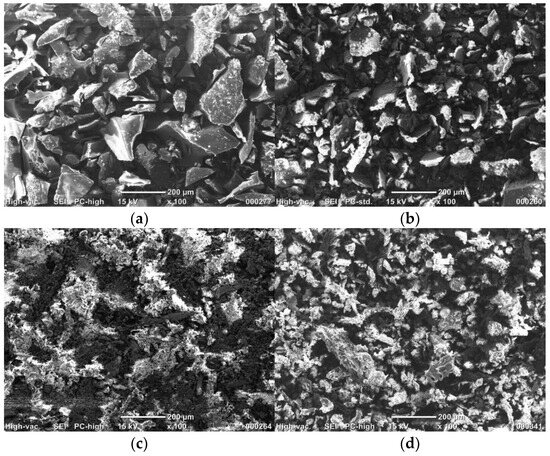 Fouling is a persistent issue encountered in biomass combustion systems. Understanding the characteristics and formation mechanisms of combustion fouling is crucial for optimising operational parameters. In this section, scanning electron microscopy (SEM) imaging is used to unravel the intricate morphology of fouling under varied Qs/Qt ratios at LI = 200 mm. In Figure 6a,b, lower flowrate ratios (Qs/Qt 0.33 and 0.50, respectively) show distinct morphological features in the SEM images. These images showcase well-defined structured fouling material, suggesting that, at lower flowrate ratios, the deposited fouling material may possess a more cohesive nature. The physical appearance of the pipes in Figure 3 and the TGA graphs in Figure 4a confirm this observation, validating the existence of higher contents of unburnt hydrocarbons and its tacky nature. The SEM images (Figure 6c–e) of conditions for Qs/Qt 0.66 and higher indicate a shift in the fouling morphology, resulting in a more compact and uniform deposition. This is obvious due to the effect of higher Qs/Qt ratios that fostered increased turbulence, which led to dispersion of the fouling deposition. As shown in Figure 5, Qs/Qt is a factor that influences the biomass peak bed temperature. Yao et al. [37] found that the fouling morphology is influenced by the biomass peak bed temperature, verifying the findings established from the SEM images in Figure 6. The images presented highlight the transition from structured, agglomerated fouling deposits at the lower Qs/Qt ratios towards the finer fouling layers at higher ratios, indicative of more compact deposition layers resulting from increased dispersion at the higher ratios.