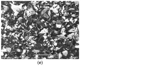 SEM images of fouling deposits samples for combustion condition LI = 200 mm at Qs/Qt ratios of (a) 0.33, (b) 0.50, (c) 0.66, (d) 0.71, and (e) 0.75.