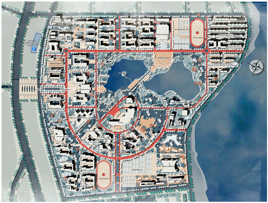 After conducting an in-depth study of the slow-moving transportation system on the Huangjiahu Campus of Wuhan University of Science and Technology, we identified several issues that need to be addressed. Since its completion in September 2005, the campus has provided a place for nearly 22,000 students to study and live, with its expansive area of 1.8 km2. As shown in Figure 1, the traffic system design of the campus is mainly centered on the artificial lake and the teaching area, forming a pattern with a circular main road as the main axis, supplemented by radial secondary roads and a square grid of side roads. While this design has successfully optimized motor vehicle flow, the planning for slow-moving traffic remains inadequate.