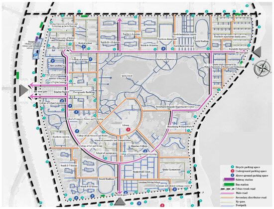 After the above research and evaluation, the main problems of the current slow-moving transportation system of Huangjiahu Campus of Wuhan University of Science and Technology are as follows: (1) the road sections near the teaching area are often congested during the peak hours, which affects the smoothness of the traffic; (2) some of the roads are improperly planned and divided into levels, which leads to the need for detours for the students and the staff; (3) the main traffic arteries in the campus are not smoothly connected with the urban public transportation, which restricts the traffic connection between the campus and the outside world; (4) the use rate of some sidewalks is not high, and the phenomenon of pedestrian–vehicle mixing is common, which is a potential safety hazard; (5) there are insufficient non-motorized parking facilities on campus, which leads to the occupation of part of the walking space; (6) the design of some slow-moving facilities, such as lighting facilities and recreational facilities, is not reasonable enough and needs to be optimized; and (7) the overall slow-moving traffic safety, comfort, and convenience need to be upgraded.