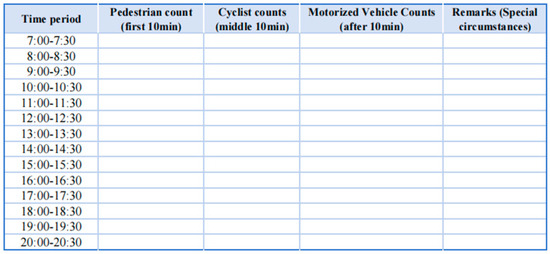The specific method of the research was as follows: in the weekdays and weekends, a day with good weather was chosen to conduct research, to ensure that the research results were typical. The research example is shown in Figure 3. Generally, for each research point, a group of three people carried out fixed-point research, over the time range of 8:00–22:00; for each hour, data were gathered successively for the first 30 min for pedestrians, bicycles, and motor vehicles, and traffic flow statistics were taken every 10 min. Every two hours, some of the remaining time was used for other statistical activities. The necessary research materials are illustrated in Figure 4 and Figure 5.