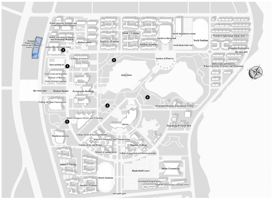The slow road system at the Huangjiahu Campus is broadly categorized into two types: the slow roads running parallel to motor vehicle roads, serving as the primary routes connecting the teaching and living areas, and the landscaped paths surrounding the campus center, primarily catering to the daily recreational and relaxation needs of students and faculty. This section presents a comprehensive quality assessment of these slow-moving spaces (specific observation locations for the assessment are shown in Figure 6), analyzing them in depth from three perspectives: safety, convenience, and comfort (specific issues analyzed as shown in Table 1).