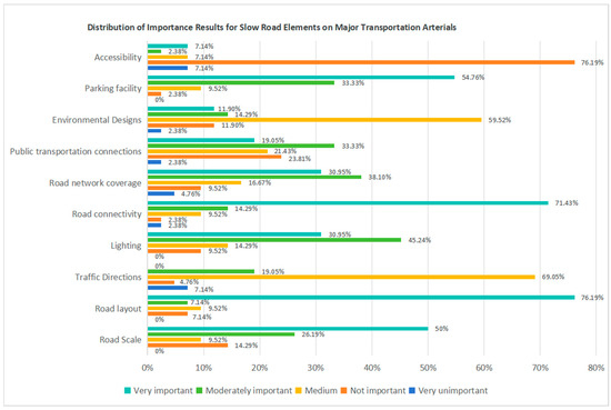 The evaluation results reveal that the importance scores range from 2.125 to 4.575, with an overall mean of 3.735. This indicates a high perception of the importance of the slow transportation system indicators among respondents, with most indicators rated as “important” or “relatively important”. Specifically, “Slow-moving road planning for major traffic arteries”, “Slow-moving road public transportation connections for major traffic arteries”, “Slow-moving road parking facilities in dormitory areas”, “Slow-moving road parking facilities in academic areas”, and “Slow-moving road gate entrance and exit scales at subway connections” received high importance ratings. This suggests that these aspects are particularly crucial for users of the campus slow-moving system. Conversely, the importance ratings for “design of slow-moving road environment in teaching areas”, “scale of slow-moving road in landscaped areas”, and “degree of improvement of overall slow-moving road facilities” are relatively low. This suggests that these aspects are considered lower priorities by users of the campus slow-moving system.