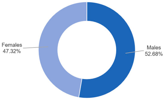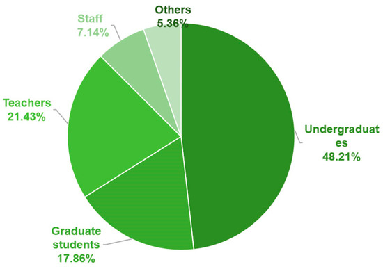 The respondents of this satisfaction survey included students, faculty, and staff from Huangjiahu Campus of Wuhan University of Science and Technology (Examples of specific percentages of respondents and gender ratios are shown in Figure 8 and Figure 9). The survey, conducted in June 2024, utilized a combination of online questionnaires and on-site distribution. A total of 115 questionnaires were distributed, of which 112 were validly completed, resulting in an effective recovery rate of 97.39%. The participants were 52.68% male and 47.32% female, reflecting a relatively balanced gender ratio.