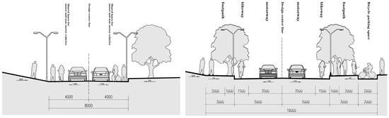 - Road scale: In accordance with the “Urban Road Engineering Design Code”, this study refines the design of campus slow-moving roads, ensuring that the minimum width of sidewalks and bicycle lanes exceeds 1.5 m, thereby providing adequate space for pedestrians and cyclists. Simultaneously, the turning radius is adjusted to decrease vehicle turning speeds and reduce the risk of traffic accidents. Additionally, in the road cross-section design, a separated layout [24] is employed to clearly distinguish between slow-moving areas and motorized vehicles, enhancing safety through green belts or physical isolation facilities.