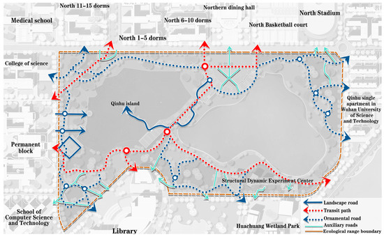 Pedestrian flow and traffic flow statistics [19]: The method of roadside manual observation was mainly adopted, which was carried out throughout the day and over different time periods, similar to the use of motor vehicle cross-section flow statistics. Pedestrian flow was mainly used to identify the high-frequency areas and peak hours of pedestrian walking trips within the Huangjiahu Campus, and to assess the carrying capacity of the existing campus slow-moving system (a schematic of the existing slow-moving system is shown in Figure 2). It was also used in conjunction with vehicle flow statistics to analyze potential areas and time periods for pedestrian–vehicle conflicts.