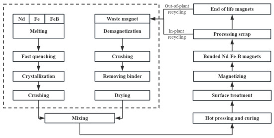 Nd-Fe-B rare earth permanent magnet materials are essential for applications in the energy, military, and aerospace sectors [1,2,3]. Presently, over 90% of the global production capacity for rare earth permanent magnets is concentrated in China within the domain of rare earth functional materials [4]. The bonded Nd-Fe-B permanent magnet material has gained considerable attention for its capacity to produce more intricate and precise workpieces at a relatively low cost [3,5,6,7]. However, the substantial energy consumption and environmental impact associated with the development of mineral resources for producing bonded Nd-Fe-B magnets warrant careful consideration [8]. The recycling of large quantities of used bonded Nd-Fe-B magnets at the end of their life cycle can mitigate the demand for additional mining of rare earth resources, thereby supporting global initiatives for “green production” [9,10].