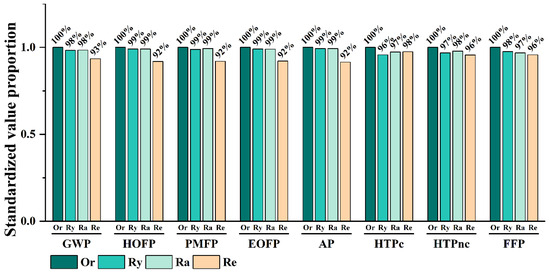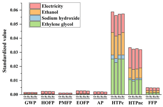 Through the data selection of intermediate points in Simapro software, we mainly studied 9 categories of mid-point environmental impact categories: Global warming potential (GWP); Photochemical oxidant formation potential: humans (HOFP); Particulate matter formation potentials (PMFP); Photochemical oxidant formation potential: ecosystems (EOFP); Acidification potentials (AP); Human toxicity potential (HTPc); Human toxicity potential (HTPnc); Surplus ore potential (SOP); Fossil fuel potential (FFP). The environmental impact categories, characteristic factors, and units of intermediate points are shown in Table 1 [36,37]. All environmental impact categories were characterized by Simapro 9.0.0.4.8