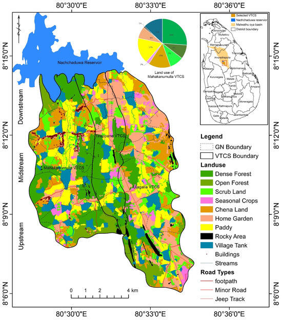 Location and land use system of the study area (Mahakanumulla VTCS) in the upper Nachchaduwa cascade complex. Land use data source: HLP-BLA [43].