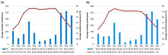 The average monthly rainfall and temperature of the study area. (a) Non-global warming period (1870–1970); (b) global warming period (1971–2020). Source: Authors developed based on weather data (1870–2020) of the Anuradhapura meteorological station.