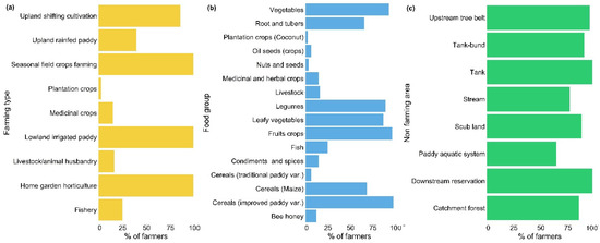 Farmers’ engagement in food production. (a) Farming types; (b) food groups; (c) wild food foraging from non-farming areas.
