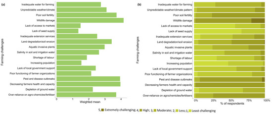 Farmers’ perceptions of major challenges affecting farming. (a) Ranking, (b) rating.