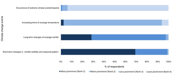 All of the interviewed farmers responded that the climate of the MVTCS area has changed over the past two decades. The farmers prioritized past climate change events based on their perceptions using rank order scale close-ended questions in the interview schedule. Among the past climate change events in the study area, 69% of the interviewed farmers had rated short-term changes in rainfall variability and patterns as the most prominent (Rank 1) climate change event during the past 10 years. However, 28.4% of the respondents rated long-term changes in average rainfall (decreasing trend) as the most prominent climate change in the area. Among the respondents, 93.8% rated the occurrence of extreme climate events (hazards) as the least prominent climate event in the area. In contrast, the trend of increasing average temperature was rated as a less prominent climate event in the area (Figure 6). In the case of the severity of CCIFs, 47 (58%) and 33 (41%) rated the influence of changes in rainfall patterns as being of amoderate and high severity, respectively. Likewise, 57 (70%) of the respondents rated the influence of dry hydrological extremes as being of a moderate severity in the study area. Overall, changes in rainfall patterns were rated as the most severe factor affecting food production (Table 4; Figure S1a). In terms of the weighted impacts, the respondents ranked the top five impacts on food production due to climate change as follows: (i) increased cost of production; (ii) increased wildlife damage; (iii) impact on human health (human stress); (iv) emergence of pests, diseases, and invasive aquatic plants; and (v) decreased biodiversity and ecosystem functions. Among the respondents, 75 (93%) weighed wildlife damage as having a high impact on food production, followed by an impact on human health (73; 90%) (Table 5; Figure S1b).