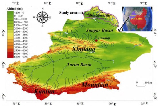 The Altay Mountains, spanning approximately 2000 km across China, Kazakhstan, Russia, and Mongolia, were selected for this study, focusing on the Chinese section. This region, situated on the southern slope of the Altay Mountains, extends roughly 450 km east–west and 80–150 km north–south, encompassing a total area of 2.6 × 104 km2 []. The topography is characterized by a gradual narrowing from northwest to southeast, with a pronounced elevation profile of high and wide in the northwest and low and narrow in the southeast (Figure 1).
