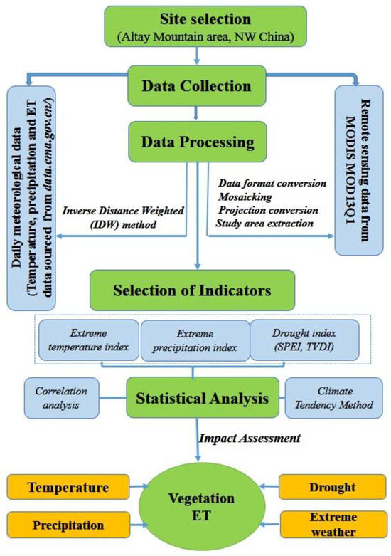 By leveraging the MODIS vegetation ET model, this study aims to uncover detailed relationships between vegetation ET and meteorological factors. It combines meteorological data with on-ground observations. This research evaluates variations in vegetation ET to assess ecosystem degradation, identify critical restoration areas, and mitigate meteorological disasters in mountain forest ecosystems. Despite the challenges posed by limited systematic data on natural disasters and human disturbances, integrating remote sensing data with field investigations and plant physiology experiments can provide invaluable insights into forest ecosystem dynamics in the Altay Mountains. We hypothesize that variations in vegetation ET in the Altay Mountains are significantly influenced by long-term changes in meteorological factors, including temperature, precipitation, and drought indices. The Altay Mountains’ forest ecosystems are particularly sensitive to climate change and human disturbances due to their alpine climate, semi-arid environment, and distinct vertical zonality.