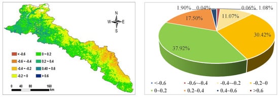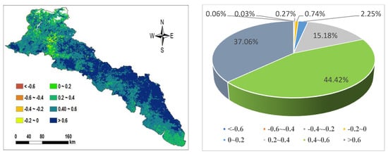 From Figure 7, it is evident that vegetation ET in the Altay Mountains shows a strong positive correlation with the SPEI across 96.47% of the area. Within this, approximately 39.96% and 47.14% of the areas exhibit correlation coefficients between 0.2–0.4 and 0.4–0.6, respectively, indicating a moderate to strong influence of the SPEI on vegetation ET in these regions.