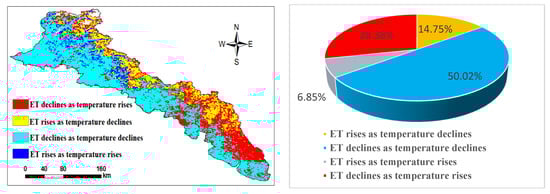Additionally, Figure 3 offers a spatial analysis of vegetation ET in relation to the annual mean temperature. This highlights the variability in ET responses to temperature gradients across the region. This analysis provides valuable insights into temperature–ET interactions’ spatial patterns and their implications for regional ecosystem dynamics.