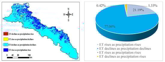 In 77.06% of the Altay Mountain region, vegetation ET decreased with decreasing precipitation, as illustrated in Figure 6. Conversely, in 21.19% of the area, vegetation ET increased with increasing precipitation. These findings underscore the sensitivity of vegetation ET to changes in precipitation levels across different parts of the Altay Mountains.