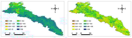 The spatial distribution of the correlation coefficient between vegetation ET and the SPEI (on the left) and TVDI (on the right) in the Altay Mountains.