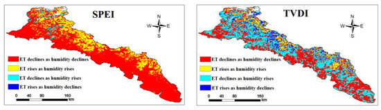 Increased and decreased areas of vegetation ET with air humidity concerning the SPEI (on the left) and TVDI (on the right) in the Altay Mountains.