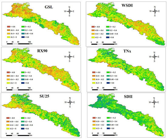 We examined various extreme weather indices to uncover vegetation ET variability trends in the Altay Mountains under extreme weather conditions. These indices include growing season length (GSL), warm spell duration index (WSDI), daily maximum temperature (TX90), occurrence of daily minimum temperature (TNx), summer days (SU25), Simple Daily Intensity Index (SDII), very wet days (R95p), and heavy precipitation days (R10). Figure 8 displays the calculated correlation coefficients between these indices and vegetation ET.
