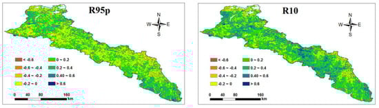 For this percentile threshold method, R95 and R99 are also used for the extreme precipitation index. According to the method used, the annual daily precipitation of a station from 1960 to 2013 is arranged in ascending order, and the mean 95th percentile over the past 50 years is defined as the threshold for extreme precipitation events []. The precipitation on a given day must exceed this threshold to be considered an extreme precipitation event. RClimDex (1.0) software was used to calculate 10 extreme precipitation indices (Table 2) based on the research needs.