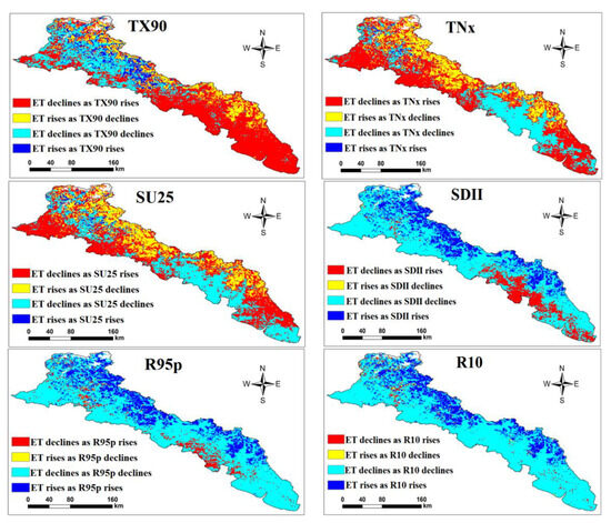 As depicted in Figure 9, vegetation ET exhibits a negative correlation with extreme temperature indices such as TX90, TNx, SU25, and WSDI. Specifically, negative correlation coefficients are observed in 68.79%, 71.87%, 66.09%, and 69.43% of the area, respectively. Conversely, vegetation ET shows a positive correlation with extreme precipitation indices including SDII, R95p, and R10. The positive correlation coefficients are 86.14%, 92.26%, and 96.19%, respectively.