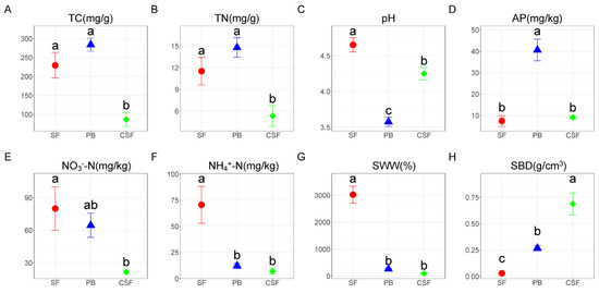 There was no significant difference in TC and TN between SF and PB, and the values in CSF were significantly lower than those in SF and PB (Figure 1A,B). Soil pH was all acidic, and the values in SF were significantly higher than those in PB, and the values in CSF were significantly lower than those in SF but significantly higher than those in PB (Figure 1C). AP in SF was significantly lower than that in PB, and that in CSF was significantly lower than that in PB, but there was no significant difference from that in SF (Figure 1D). NO3−-N and NH4+-N were the highest in SF, and NH4+-N was significantly higher than that in PB, but there was no significant difference in NO3−-N (Figure 1E,F). NO3−-N and NH4+-N in CSF were significantly lower than those in SF, but there was no significant difference between them and the values in PB. SWW in SF was significantly higher than that in PB, and its value in CSF was significantly lower than that in SF but had no significant difference from that in PB (Figure 1G). SBD in SF was significantly lower than that in PB, and its value in CSF was significantly higher than that in SF and PB (Figure 1H).