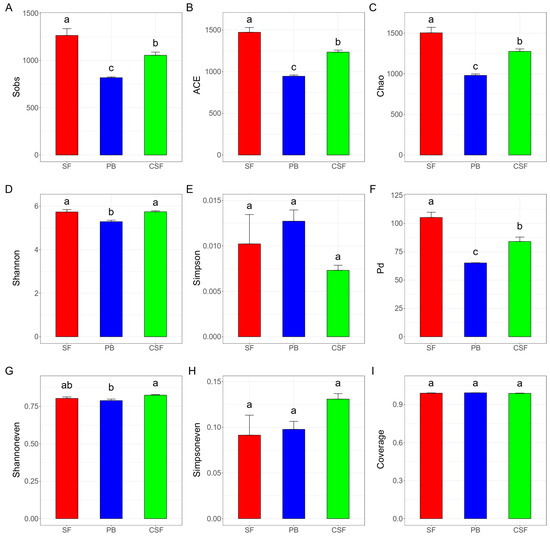 Comparison of soil bacterial α diversity among Sphagnum fen (SF), Polytrichum bog (PB), and Cryptomeria swamp forest (CSF). Sobs—the observed richness (A); ACE—the ACE estimator (B); Chao—the Chao1 estimator (C); Shannon—the Shannon diversity index (D); Simpson—the Simpson diversity index (E); Pd—phylogenetic diversity (F); Shannoneven—a Shannon index-based measure of evenness (G); Simpsoneven—a Simpson index-based measure of evenness (H); Coverage—the Good’s coverage (I). Sobs, ACE, and Chao reflecting on community richness; Shannon, Simpson, and Pd reflecting on community diversity; Shannoneven and Simpsoneven reflecting on community evenness; and Coverage reflecting on community coverage. Error bars indicate the standard errors (n = 3). Lowercase letters (a, b, c) represent significantly different values of the studied parameter with a 95% confidence interval, confirmed by ANOVA with subsequent LSD comparisons.