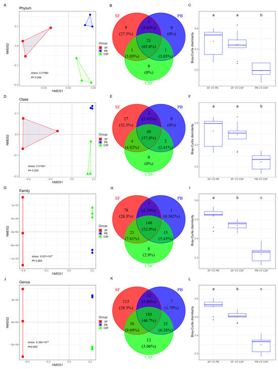 Variations of soil bacterial composition among Sphagnum fen (SF), Polytrichum bog (PB), and Cryptomeria swamp forest (CSF) at phylum (A–C), class (D–F), family (G–I), and genus levels (J–L). (1) Comparison of soil bacterial composition among different types of sites by NMDS based on Bray–Curtis distance (A,D,G,J). (2) The number of shared and unique taxa across different types of sites (B,E,H,K). (3) Comparison of the dissimilarities of soil bacterial communities between different types of sites (C,F,I,L). Each box plot represents the maximum, minimum, 75th, and 25th quartiles, respectively; the line of each box plot represents the median, and the red point of each box plot represents the mean (n = 9). Lowercase letters (a, b, c) represent significantly different values of the studied parameter with a 95% confidence interval, confirmed by ANOVA with subsequent LSD comparisons.