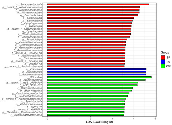 Indicator group analysis of bacterial communities in Sphagnum fen (SF), Polytrichum bog (PB), and Cryptomeria swamp forest (CSF) with LDA SCORE > 3.5.