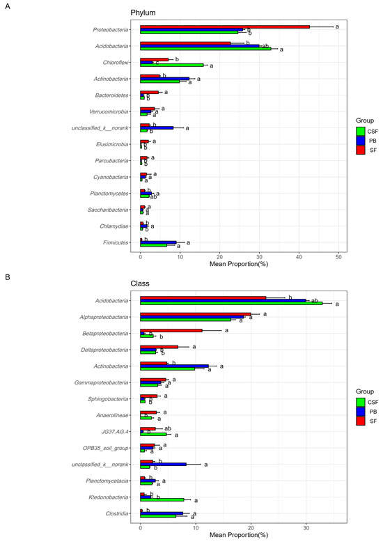 The results of NMDS analysis based on Bray–Curtis showed that the soil bacterial communities at the genus, family, class, and phylum levels showed clear aggregation types in SF, PB, and CSF (Figure 3A,D,H,K). At the class and phylum levels, the distance between SF and PB was not significantly different from that between SF and CSF, both of which were significantly higher than that between PB and CSF (Figure 3C,F). At the genus and family levels, the Bray–Curtis distance between the soil bacterial communities of SF and PB was the largest, which was significantly greater than the distance between SF and CSF, and the distance between PB and CSF and the distance between CSF and SF were significantly higher than the distance between CSF and PB (Figure 3I,L).
