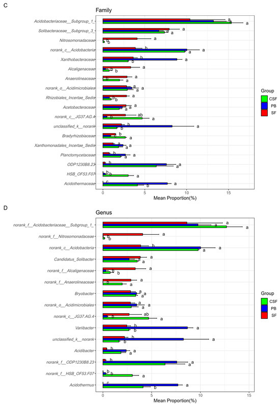 Comparison of the relative abundance of major groups of soil bacteria in Sphagnum fen (SF), Polytrichum bog (PB), and Cryptomeria swamp forest (CSF) at phylum (A), class (B), family (C), and genus (D) levels. The main groups of soil bacteria were composed of the top ten groups in the relative abundance of each type of site. Error bars indicate the standard errors (n = 3). Lowercase letters (a, b, c) represent significantly different values of the studied parameter with a 95% confidence interval, confirmed by ANOVA with subsequent LSD comparisons.