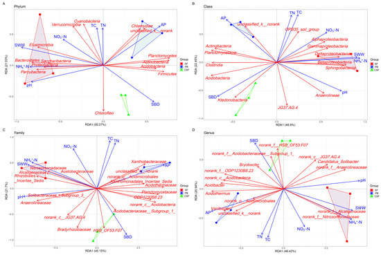 Redundancy analysis showing the relationship between soil physicochemical properties and major groups of soil bacterial communities in all types of sites at phylum (A), class (B), family (C), and genus (D) levels. SF—Sphagnum fen; PB—Polytrichum bog; CSF—Cryptomeria swamp forest.